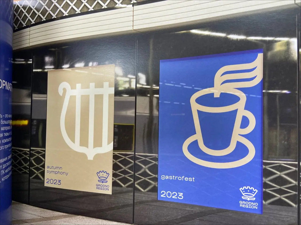 Фирменными цветами стали золотой, синий и белый. А в паттерне — узоре, заложены элементы гербов районов Гродненской области. В качестве слогана выбрали фразу «Grodno Region — территория комфортного туризма».