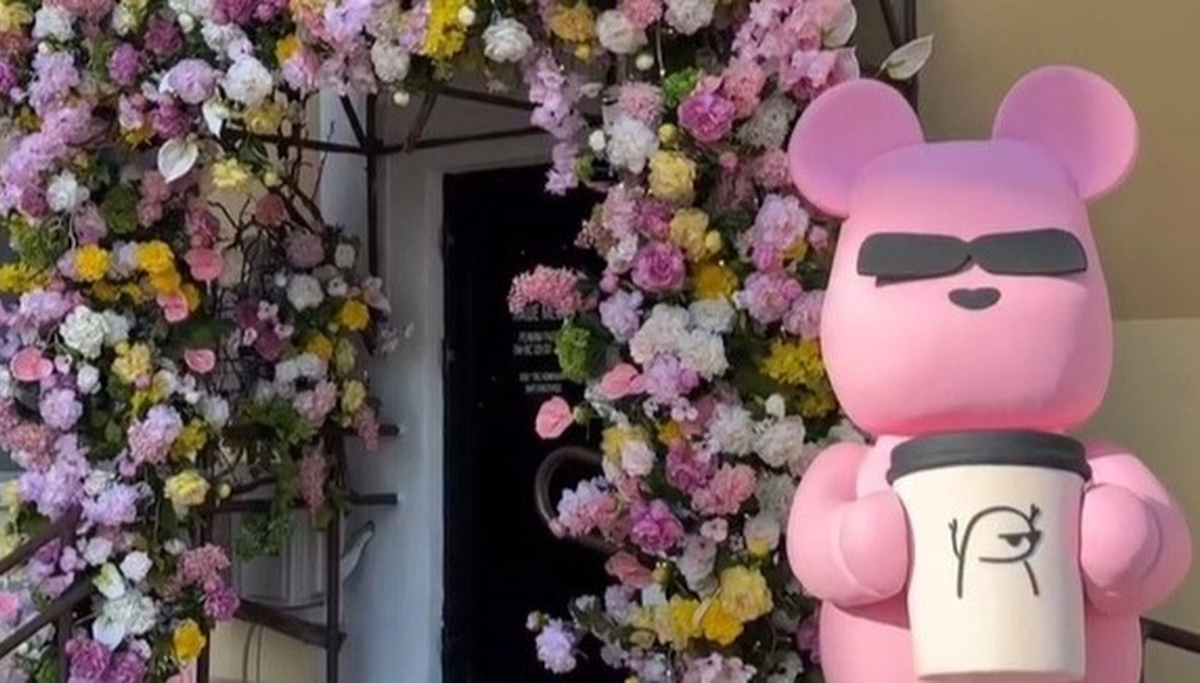 В этом году у входа появились цветочные композиции и большой розовый медведь со стаканчиком кофе. Локация выглядит эффектно и днём, и вечером благодаря подсветке. Иногда, чтобы сфотографироваться около входа в кафе, приходится постоять в очереди.