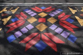 Зубры в цветах, орнамент и яркие краски: аллею из картин на асфальте презентовали в День города, пишет grodnonews.by.