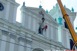 Главный католический храм города с начала мая начали готовить к большой покраске. Сейчас рабочие на высоте очищают стены костела и вскоре приступят к ликвидации…