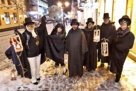 Вечером 9 января необычный костюмированный перфоманс устроили в центре Гродно гости из России и Украины. Компания из восьми туристов в черных костюмах и с…