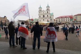 Несколько человек с флагами ОГП, БХД и бело-красно-белым флагом собрались в воскресенье 19 февраля в 14.00 на ступеньках дворца культуры текстильщиков. Они кричали «Жыве Беларусь»…
